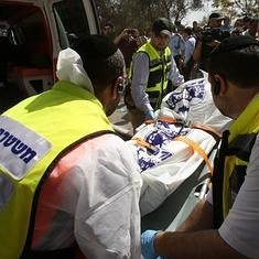 Voluntarios israelíes trasladan a una de las víctimas del ataque perpetrado contra un autobús.