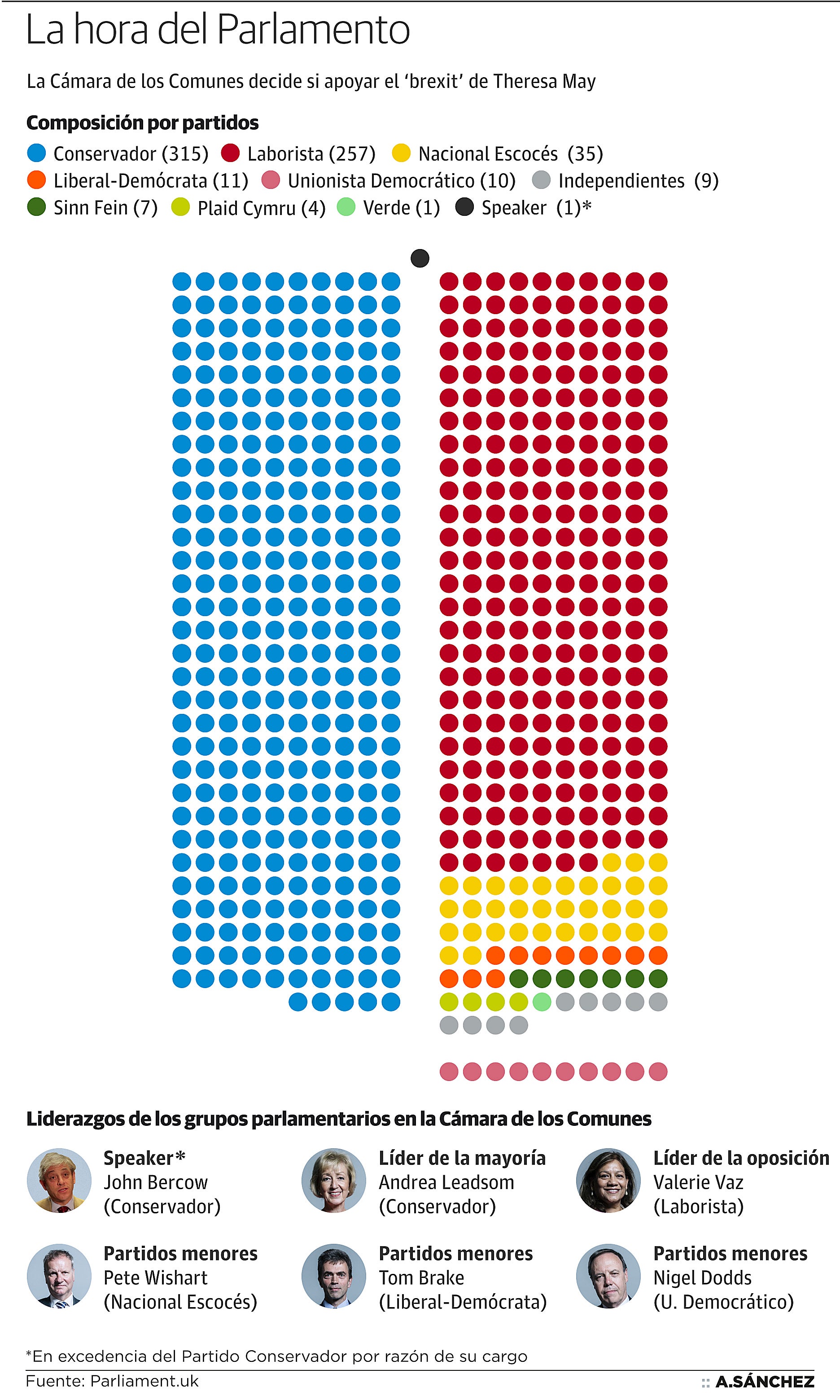 Primero, porque al menos un tercio de los diputados de su partido, el Conservador, se han declarado en rebeldía e iban a pronunciarse en contra de los planes de May. Con el exministro Boris Johnson como cabeza visible, la mayoría de ellos asegura que el pacto al que llegó la 'premier' con la Unión Europea es «humillante». Quieren un 'Brexit' sin acuerdo, por las bravas, aunque todos los analistas económicos coinciden en que ésta sería la peor de las soluciones porque provocaría una recesión profunda en el país. Pero no sólo eso: otra parte de su partido, el minoritario pero ruidoso frente 'proeuropeo' de los 'tories', se une a la oposición para reclamar un segundo referéndum. De esta forma, los conservadores tienen 315 diputados y en principio, apenas 200 la ap