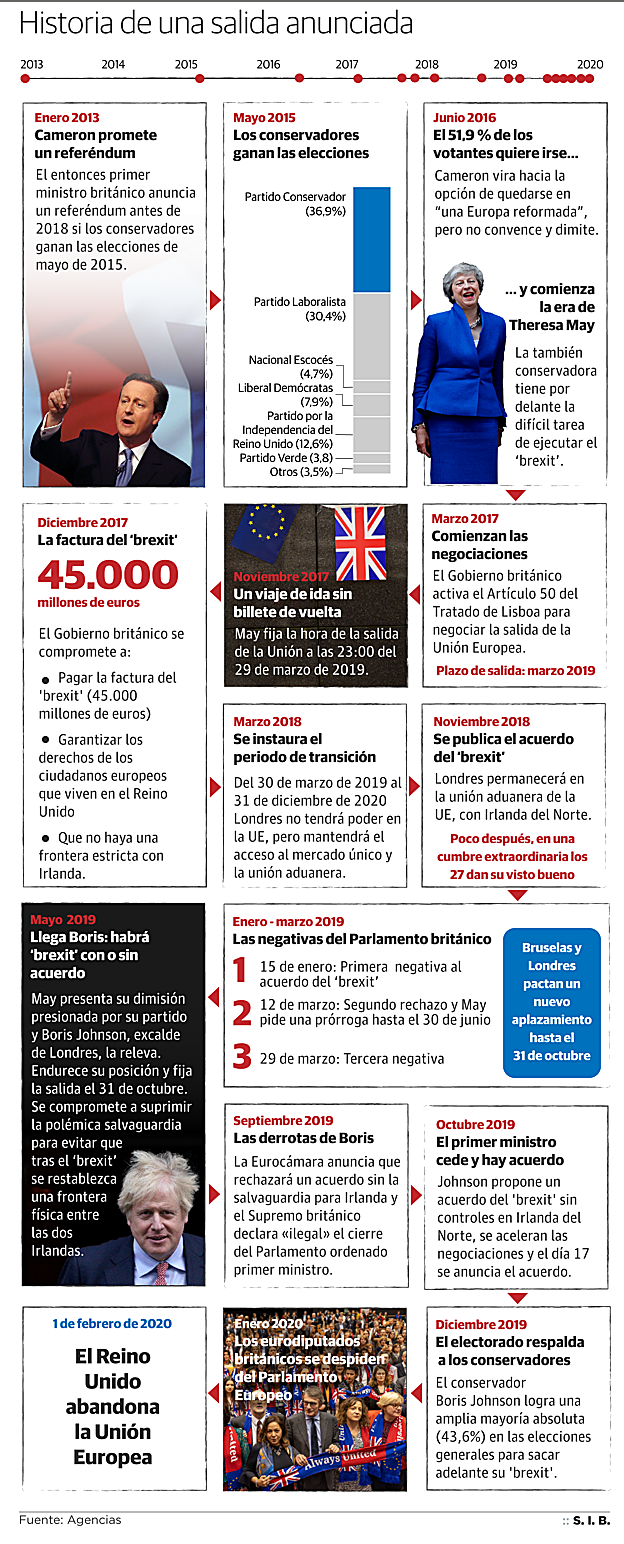 El primer ministro británico, Boris Johnson, afirmó anoche en un discurso emitido por televisiones y en la red su convencimiento de que el 'brexit' será «un deslumbrante triunfo», porque «desatará todo el potencial» de Reino Unido. «Es el momento en el que amanece y se abre el telón para un nuevo acto en nuestro gran teatro nacional», dijo, «un momento de renovación y de cambio genuino».