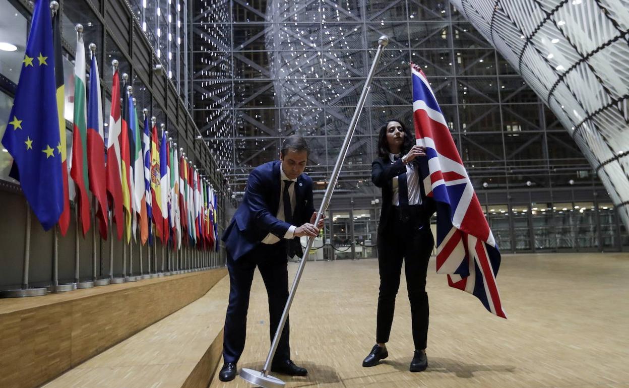 Dos trabajadores retiran la bandera de Reino Unido de la sede del Parlamento Europeo. EFE
