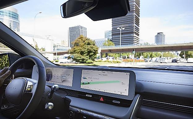 En el interior, tal y como comentábamos en el apartado de diseño, destaca el «dual cockpit» en el salpicadero, con una pantalla táctil de 12 pulgadas y un cuadro de instrumentos digital de 12 pulgadas sin carcasa. Además y por primera vez en un vehículo Hyundai, el IONIQ 5 cuenta con un Head-Up Display con realidad aumentada, que básicamente convierte el parabrisas en una pantalla de visualización.