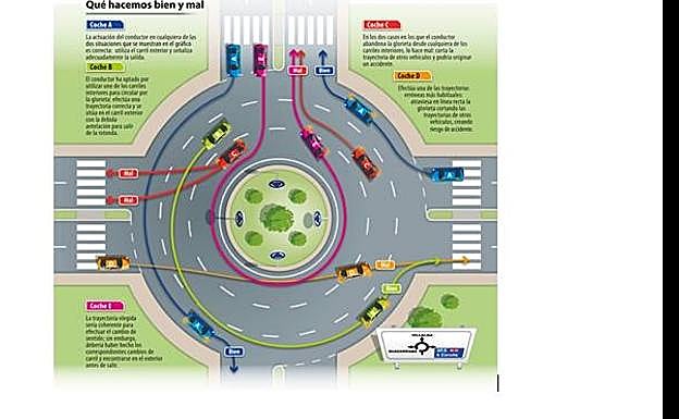 El 45% de los conductores usa el carril interior y sale desde este. Esta es una de las maniobras más peligrosa y la que conlleva más accidentes leves y pequeños alcances en una rotonda.