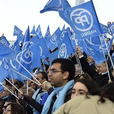 Militantes y seguidores del PP enarbolan banderas del partido durante un mitin en Las Rozas.