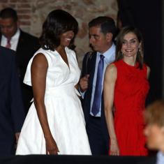Obama, que en las distancias cortas es espontánea y amable, llevaba un vestido blanco con falta y escote en V y la Reina, un vestido rojo de Nina Ricci y unos pendientes largos de Tous. Aunque pese al duelo de estilos que se preveía y a la tendencia de que la presencia de doña Letizia cree una pantalla sobre el tema que se trata, el peso de la mañana lo tuvo el discurso de Obama.