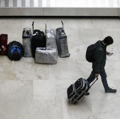 Pasajero traslada su maleta tras recogerla de la cinta transportadora del aeropuerto de Barajas.