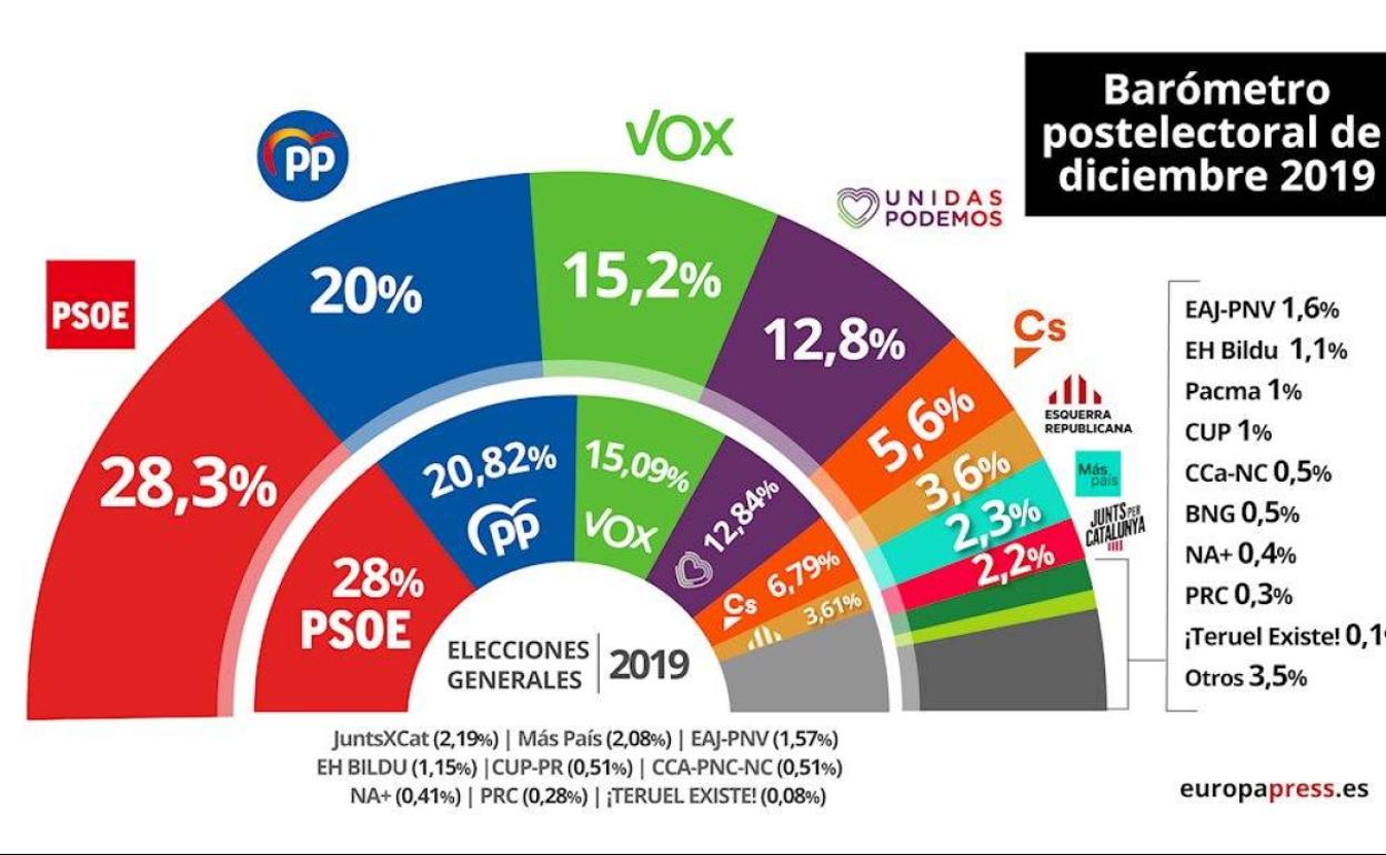 Estas respuestas hay que ponerlas en contexto. El trabajo de campo del sondeo, que cuenta con 4.800 entrevistas, fue realizado entre el 29 de noviembre y el 19 de diciembre. Es decir, para entonces ya se sabía que Sánchez había alcanzado un acuerdo para constituir un Gobierno de coalición con Pablo Iglesias y que estaba negociando con Esquerra Republicana de Catalunya para que le facilitara la investidura.
