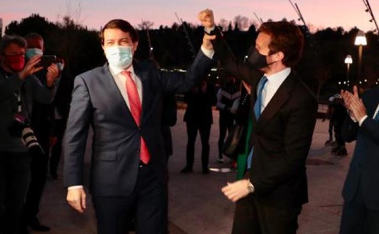 Alfonso Fernández Mañueco y Pablo Casado, presidente del Partido Popular, se saludan a las puertas del edificio de las Cortes. CARLOS ESPESO