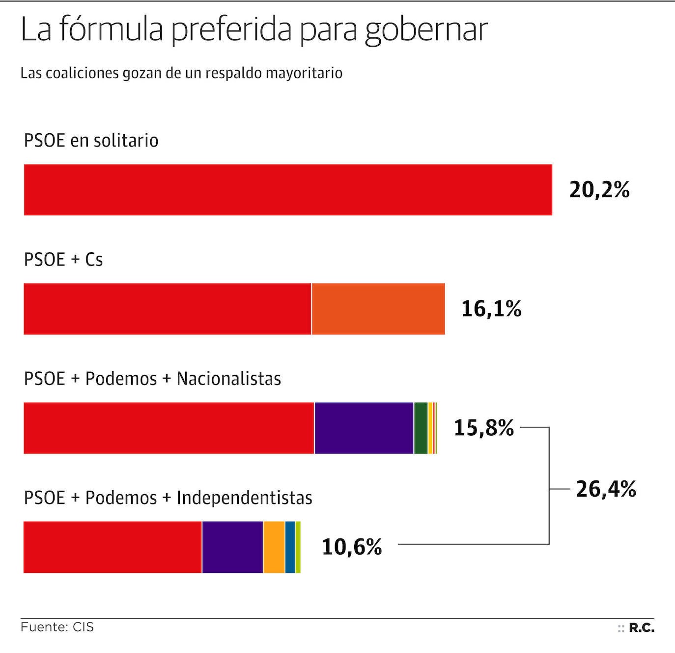 Aunque solo uno de cada cinco ciudadanos respalda la tesis del gobierno monocolor, esa fórmula cuenta con un respaldo mayor entre los votantes socialistas, el 48%. Pero la alianza con los morados tiene también adeptos en esa parroquia, el 26,2%, si bien la mayoría la apoya solo si los nacionalistas forman parte de la entente. El acuerdo con Ciudadanos, bien visto por el 16% de los consultados por el CIS, tiene poco crédito entre el electorado socialista, el 10%. Nada que ver con el apabullante apoyo que despierta entre los votantes naranjas, el 66,5% se declara partidario de una coalición con el PSOE.