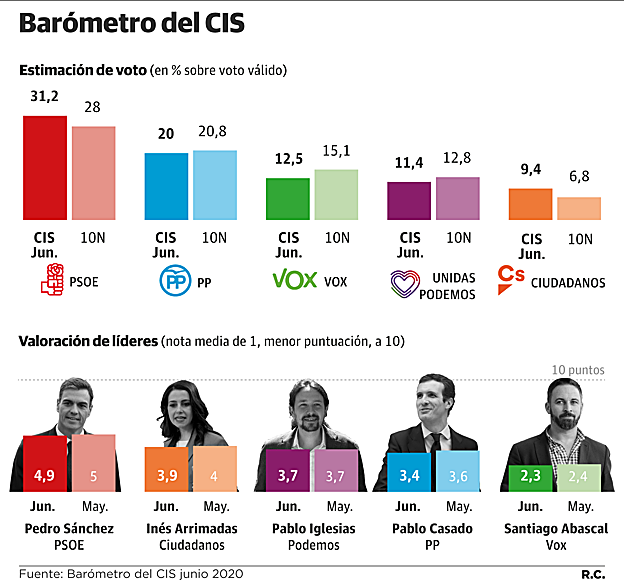 El PSOE no acusa el desgaste por la gestión de la desescalada y mantiene una amplia ventaja sobre el PP, según el último barómetro del CIS. Los socialistas conservan el 31,2% de la intención de voto, una décima más respecto al estudio de mayo y 3,2 puntos por encima de su resultado el 10-N. El partido de Pedro Sánchez sigue a once puntos de distancia de los populares, que, por el contrario, pierden tres décimas en el último mes y se quedan en el 20%, sin rentabilizar su estrategia de oposición durante la epidemia. El porcentaje es similar al que obtuvieron el pasado noviembre en las urnas (20,8%).