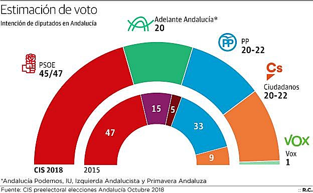 El escenario político que se abrirá en Andalucía tras las elecciones autonómicas será aún más complicado que el de de marzo de 2015, en el que Díaz tardó tres meses en lograr el apoyo de Ciudadanos para ser investida. El PSOE lograría, de acuerdo al estudio del CIS, el 37,4% de los votos y entre 45 y 47 diputados. En las anteriores elecciones, logró el 35,4% de las papeletas y 47 escaños. Es decir, los socialistas mejoran un poco sus expectativas de voto, pero no logran aumentar su presencia en el Parlamento autonómico porque en 2015 cosecharon 47 diputados, lejos, como ahora, de los 55 diputados que dan la mayoría absoluta.