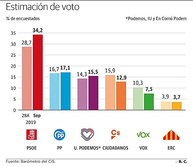 El PSOE ganaría con comodidad las elecciones si se celebrasen ahora. El sondeo del CIS de septiembre estima que recibiría el 34,2% de los votos, cinco puntos y medio más que el 28 de abril, y duplicaría al PP, que se quedaría en el 17,1%. Pero la encuesta también señala que los ciudadanos pasan factura a los socialistas por el fracaso de las negociaciones con Unidas Podemos para formar Gobierno y caen tres puntos y medio en intención directa de voto.
