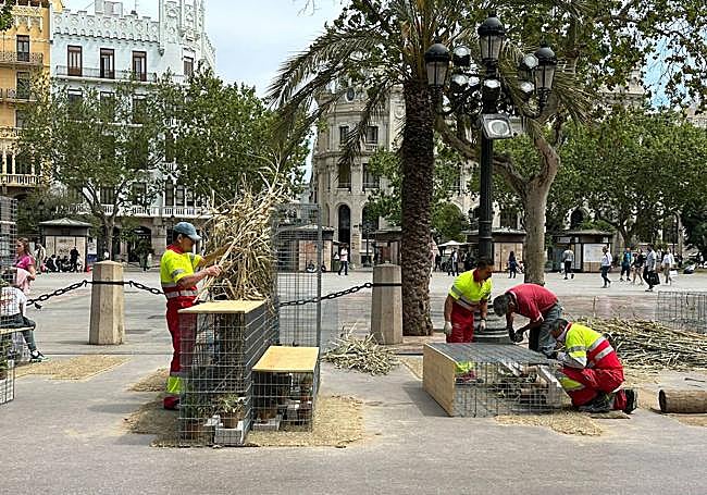 Fin a la fiesta electoralista de Sandra Gómez. Un grupo de operarios procede a retirar este jueves de la plaza del Ayuntamiento de Valencia ... los paneles de la exposición 'La Valentina' impulsada por la Concejalía de Desarrollo y Renovación Urbana que dirige la vicealcaldesa del PSPV.