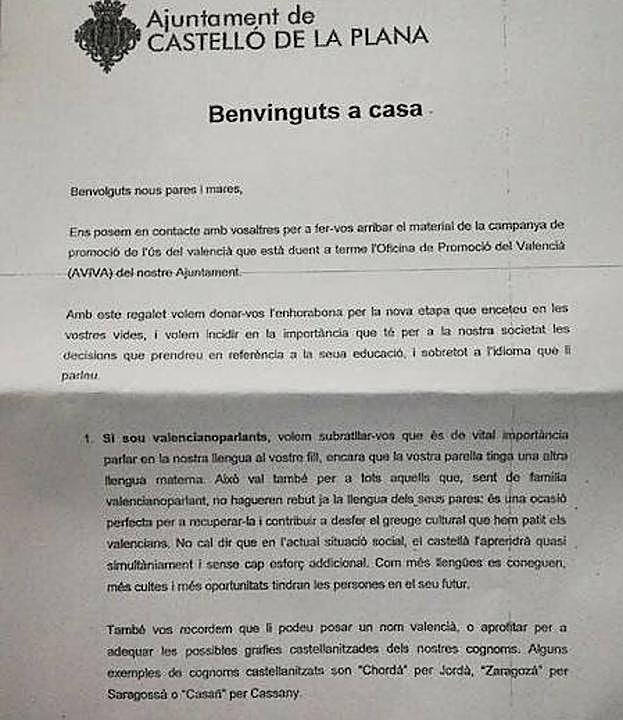 «Comenzar en valenciano es comenzar con buen pie. Es su vida. Es nuestro futuro». Bajo el lema de «Bienvenidos a casa», un total de doce ayuntamientos de la Comunidad Valenciana han puesto en marcha una campaña dirigida a los padres de bebés recién nacidos en la que, a través de cartas distribuidas por las matronas en los hospitales públicos y centros de salud, se insta a los progenitores a «aprovechar para adecuar las posibles grafías castellanizadas de vuestros apellidos» y se les recuerda que «les podéis poner un nombre en valenciano», según informa ABC.