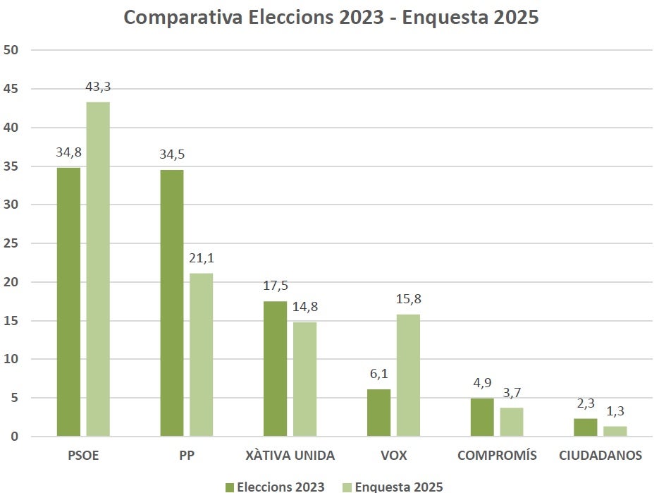 Según los resultados de la encuesta, en los que se han entrevistado a 402 personas y que se toma como referencia a los partidos que actualmente conforman la Corporación municipal, los socialistas encabezados por el alcalde Roger Cerdà, ganaría dos concejales respecto a las elecciones de 2023. Su socio de gobierno, Xàtiva Unida, en cambio, perdería un concejal, pasando de 4 a 3. Aún así la mayoría de izquierdas en el Consistorio setabense se mantendría.