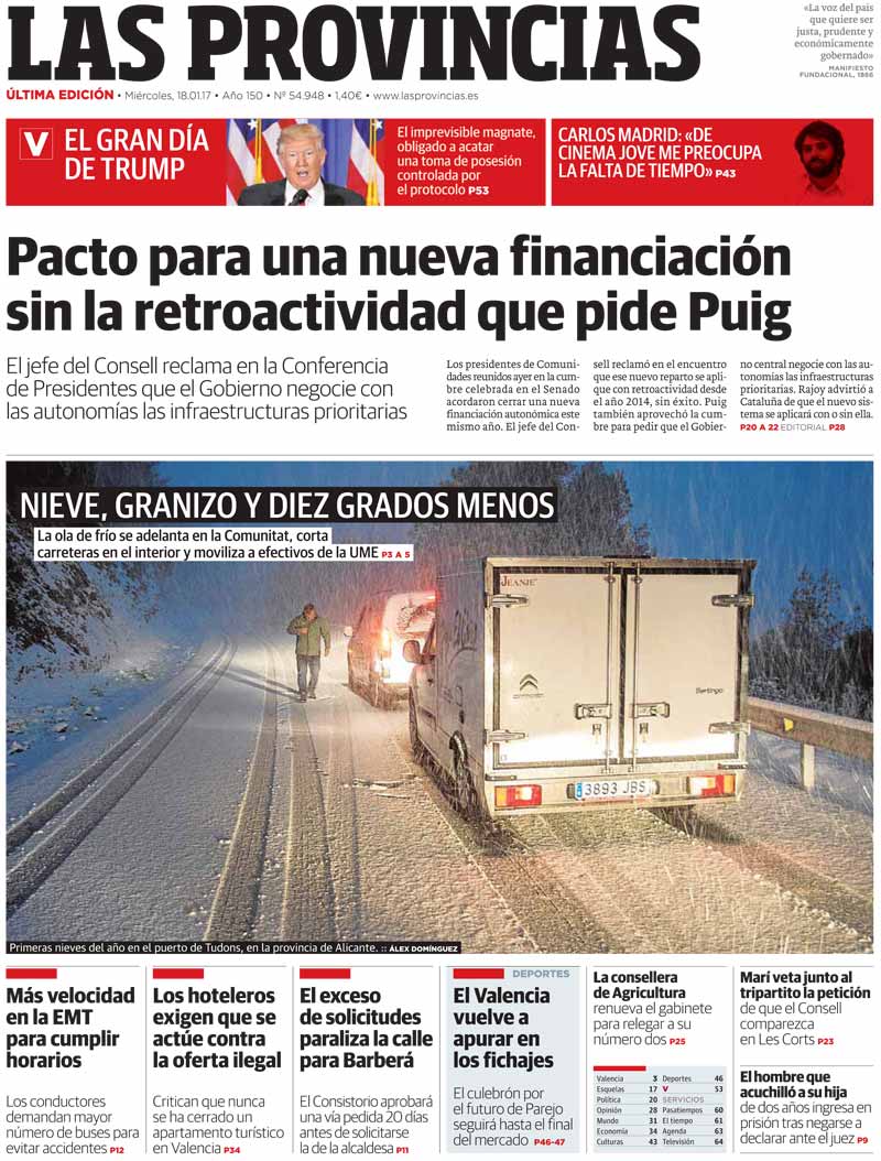 Consulta la portada impresa del periódico LAS PROVINCIAS de este miércoles 18 de enero de 2017, que ya puedes adquirir en el kiosko o consultar online a través de Kiosco y Más.