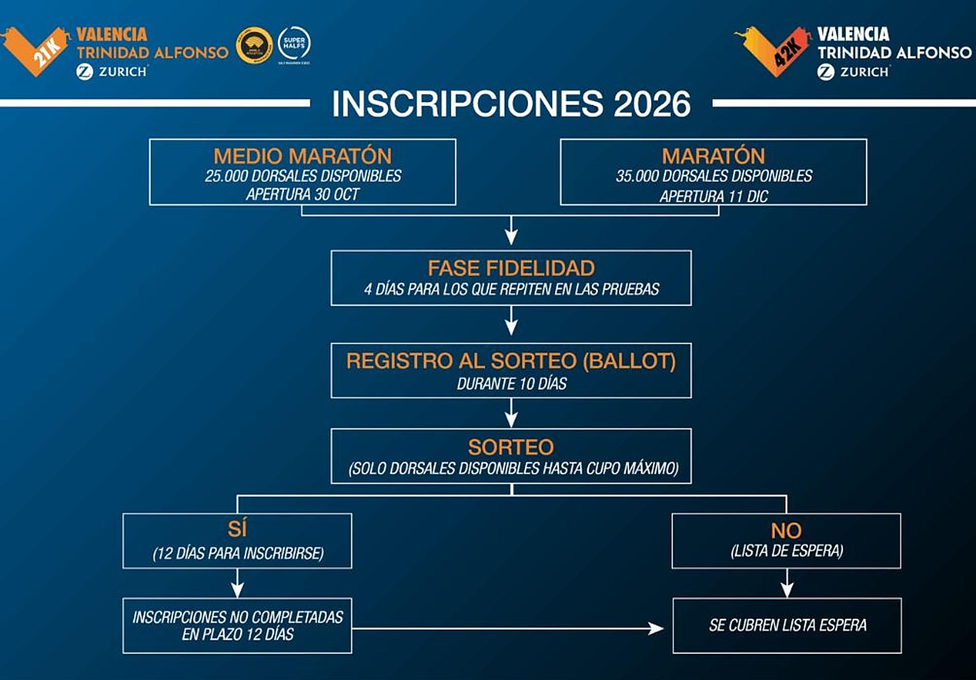 De esta forma, se mantendrá un plazo preferencial de fidelidad (4 días) para las personas inscritas de 2025 (finishers o no, es decir, que estuviera inscrito y no se haya dado de baja por lesión, cambio de titular o servicio de reembolso) que quieran repetir en 2026 y, después, se abrirá un registro al público en general para el sorteo o 'ballot' del resto de plazas disponibles hasta completar los 35.000 dorsales.