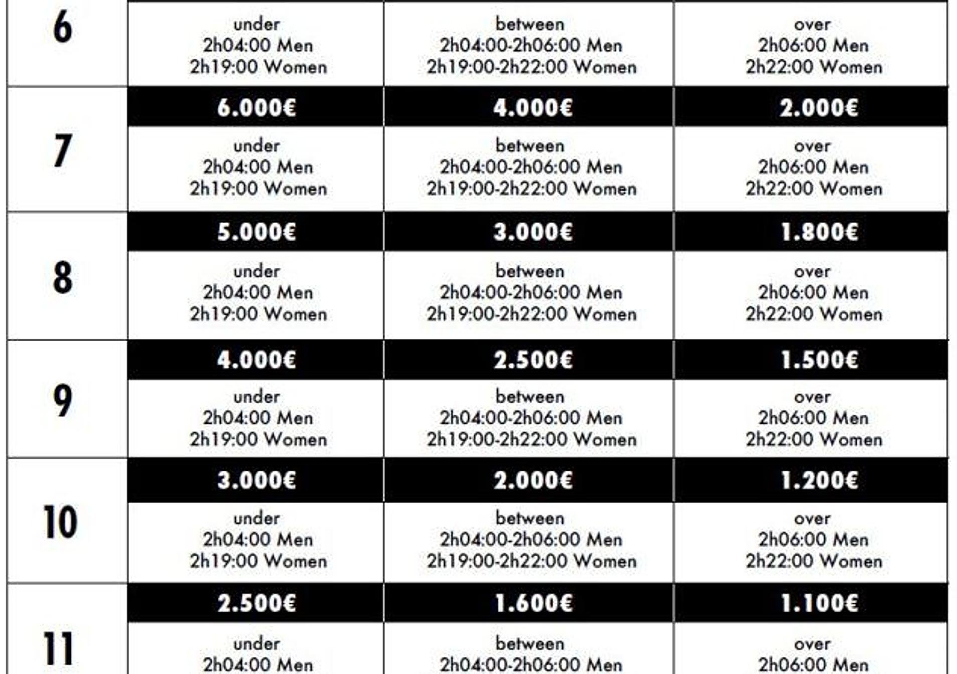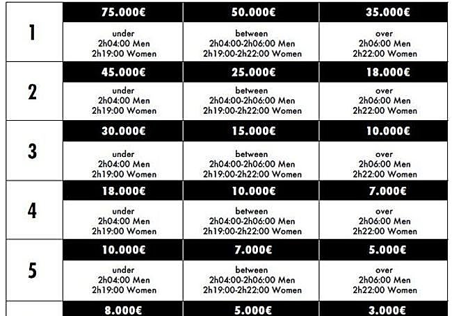 Estos premios se pagarán siempre que se consigan tiempos inferiores a 2h20:00 en hombres y 2h45:00 en mujeres. Los hombres que realicen un tiempo entre 2h20:00 y 2h35:00 y las mujeres que realicen un tiempo entre 2h45:00 y 2h55:00 tendrán una reducción del 50% en su premio.