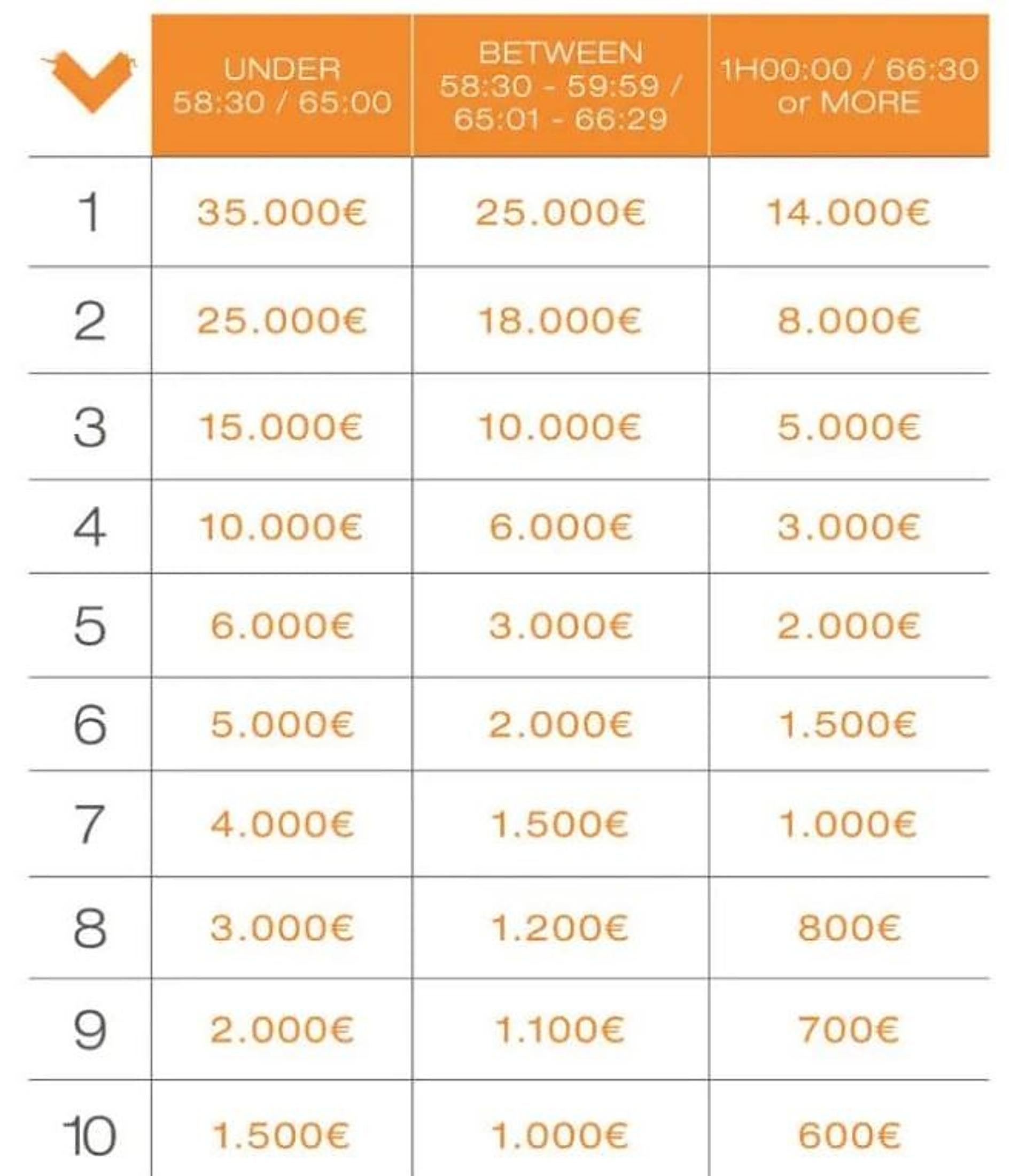 Para tener opción a estos premios en metálico, los corredores deberán efectuar una marca inferior a 1:06:00 y las corredoras 1:15:00. Los corredores que realicen marca entre 1:06:00 y 1:10:00 y las corredoras que hagan marca entre 1:15:00 y 1:25:00 cobrarán el 50% del premio, no teniendo derecho alguno a premio en metálico los corredores que realicen marca superior a 1:10:00 y las corredoras que realicen marca superior a 1:25:00.