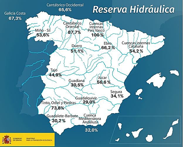 Las del Cantábrico Oriental se encuentran al 87,7% (igual que hace siete días); Cantábrico Occidental al 65,6% (62,4 hace una semana); Miño-Sil al 53,6% (52,4%); Galicia Costa al 67,3% (65,3%); Cuencas internas del País Vasco al 100% (igual que la semana anterior); Duero al 51,1% (50,4%); Tajo al 44,9% (44,6%); Guadiana al 30,5% (30,4%); Tinto, Odiel y Piedras al 73,8% (igual); Guadalete-Barbate al 30,2% (29%); Guadalquivir al 29% (28,7%); Cuenca Mediterránea Andaluza al 32% (29,1%); Segura al 34,1% (32,9%); Júcar al 56,6% (55,1%), Ebro al 66,2% (64,4) y Cuencas internas de Cataluña al 54,2% (52,4%).