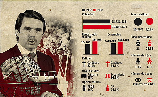 En 1988, el PSOE de Felipe González atravesaba el ecuador de su segundo mandato electoral, refrendado tras la mayoría absoluta de 1986 y a pesar de la dura reconversión industrial y unos problemas de desempleo casi intrínsecos a la economía española que derivaron en una huelga general ese mismo año el país afrontaba con optimismo el futuro, en el marco de la Comunidad Económica Europea desde dos años antes, instalado en la modernidad, con una democracia ya consolidada y con la vista puesta en el año 1992 y en los Juegos Olímpicos de Barcelona y la Exposición Universal de Sevilla, dos citas incomparables que trajeron consigo la primera línea del AVE entre Madrid y Sevilla y la transformación de la ciudad condal y en las que España mostró al mundo el enorme cambio experimentado en los años anteriores. El progresivo pero lento declive del 'felipismo', arrastrado por varios escándalos y casos de corrupción como el 'caso Filesa' y los años de plomo de la banda terrorista ETA con un goteo incesante de víctimas marcarán la transición hacia los años noventa, que supondrán la llegada al poder en 1993 del PP de José María Aznar, coincidiendo con una aguda crisis económica que dejó un aumento del desempleo al 24%, una caída de los beneficios y de la inversión de las empresas y una deuda pública disparada de casi 30 billones de pesetas. Son también años de nuevos progresos en el proceso de integración europea y en febrero de 1992 se firma el tratado de Maastricht, acuerdo fundacional de la moderna Unión Europea y primer paso hacia la llegada del euro, completada una década después en el grueso de estados comunitarios. En 1990, dos nuevos canales en abierto y uno de pago por visión revolucionan la televisión española. Antena3, Telecinco y Canal+ ponen punto y final al monopolio de TVE en la pequeña pantalla y traen consigo producciones que reúnen a millones de espectadores y alcanzan récords de audiencia hoy inimaginables, como las series 'Farmacia de guardia' (1991-1995) y 'Médico de familia' (1995-1999), convertidas en dos iconos de la cultura popular de la época, formatos como 'Las noticias del guiñol' y un nuevo concepto para las retransmisiones futbolísticas. Por José Manuel Andrés