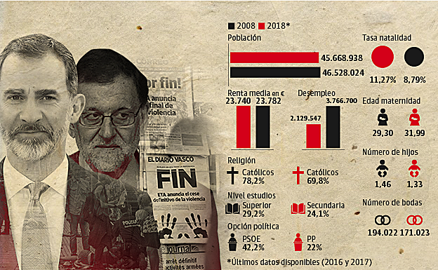 Los últimos diez años de la historia de España han estado marcados por la crisis económica, los escándalos de corrupción y, como no, por la tecnología. Desde 2008 hasta hoy ha cambiado por completo el uso que los españoles hacen de internet y sus herramientas de trabajo diario. Un ejemplo: en 2008 nacía Facebook en español y hasta 2010 Whatsapp no llega a España. 2008 es el año en el que empieza la crisis bajo el Gobierno de Zapatero y se produce la tragedia de Spanair en la que mueren 154 personas que volaban de Madrid a Las Palmas. Pero no todo han sido malos datos económicos y catástrofes. También ha sido una década de grandes reformas sociales: en 2012 el Tribunal Constitucional aprueba el matrimonio homosexual, un año antes entró en vigor la Ley Antitabaco que prohibió fumar en bares y restaurantes y en 2010 entra en vigor una Ley del Aborto mucho más acorde a los tiempos. Poco a poco, la crisis económica fue apaciguándose y problemas dramáticos como los 400.000 desahucios ejecutados desde 2007, empieza a descender a partir de 2015. Una de las mayores conquistas democráticas de la década fue el fin de la violencia de ETA. El 20 de octubre de 2011 la banda terrorista anunció el cese definitivo de la violencia tras más de medio siglo de terror y 858 asesinatos. Pero el terrorismo internacional aumentó su presencia en Europa. Tras haber sufrido el 11-M en 2004 con 193 víctimas, en España puso de nuevo sus ojos el pasado 17 de agosto en las Ramblas de Barcelona y en las localidades de Cambrils y Alcanar, dejando 16 muertos. Y en esta década hubo hasta cambio de rey. El acontecimiento más importante en la monarquía española tuvo lugar el 2 de junio de 2014, cuando el rey Juan Carlos abdicó en nombre de su hijo, que se coronó como Felipe VI. A nivel político, Cataluña ha sido el foco de los últimos años. El momento culmen del independentismo tuvo lugar el pasado 1 de octubre con la celebración del referéndum ilegal. Después, la huida de Carles Puigdemont a Bruselas el 30 de octubre, la aplicación del Artículo 155 por parte del Gobierno de Rajoy y las elecciones del 21 de diciembre, aunque este capítulo de la historia reciente de España aún no ha terminado. Por Edurne Martínez