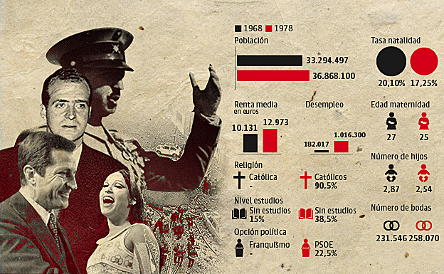 Al final de la década de los sesenta, algo comenzaba a cambiar en España. Entre 1968 y 1978, el país vivió momentos clave de su historia, como el final de la dictadura franquista, la celebración de elecciones democráticas o la firma de la Constitución de 1978. También tuvo lugar el nacimiento de la banda terrorista ETA, que en junio del 68 llevó a cabo su primer asesinato, el guardia civil José Antonio Pardines. Meses después, el asesinato del comisario franquista Melitón Manzanas provocó que se declarara el estado de excepción en el País Vasco y una oleada de detenciones que desmanteló temporalmente su dirección. En 1973 la banda terminó con la vida del presidente Luis Carrero Blanco y, en 1975, comenzó la 'guerra sucia' del Estado contra ETA. Ese mismo año moría Franco, aunque no hubo elecciones hasta 1977, cuando se pasó del Movimiento Nacional como partido único a la legalización de formaciones políticas. Venció la UCD de Adolfo Suárez. Los años finales de la década de los 70 supusieron la apertura en todos los sentidos de un país en el que no existía el divorcio, los métodos anticonceptivos estaban penalizados y había pena de muerte. Tener coche era un lujo poco accesible para los españoles, que sí tenían en su casa frigorífico o una televisión en blanco y negro donde veían los dos canales que existían. Las imágenes mostraban el conflicto árabe-israelí, los últimos estertores de la guerra de Vietnam, la crisis del petróleo, la llegada a la Luna del Apolo 11, el cambio de Papa o el escándalo Watergate que se llevó por delante al presidente Nixon; pero también cómo Massiel ganaba Eurovisión con 'La la la', los Beatles copaban los primeros puestos de las listas de éxitos, morían artistas como Elvis Presley o Charles Chaplin y Uri Geller doblaba cucharillas 'con la mente'. Por Rosario González