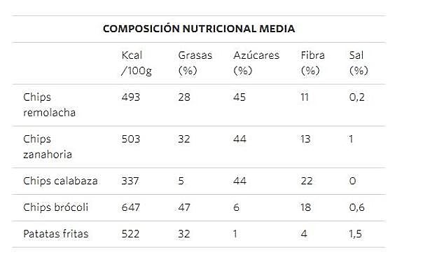 En los últimos años, y como una de las opciones más 'saludables', han llegado a los supermercados las bolsas de 'chips' vegetales, unas finas láminas de hortalizas fritas y aderezadas con sal hechas a partir de remolacha, batata, yuca, calabaza o zanahoria, entre otros. Sin embargo, y a pesar de que el término «vegetales» puede dar pie a pensar que son más beneficiosas y nutritivas que otros aperitivos, lo cierto es que no es así.