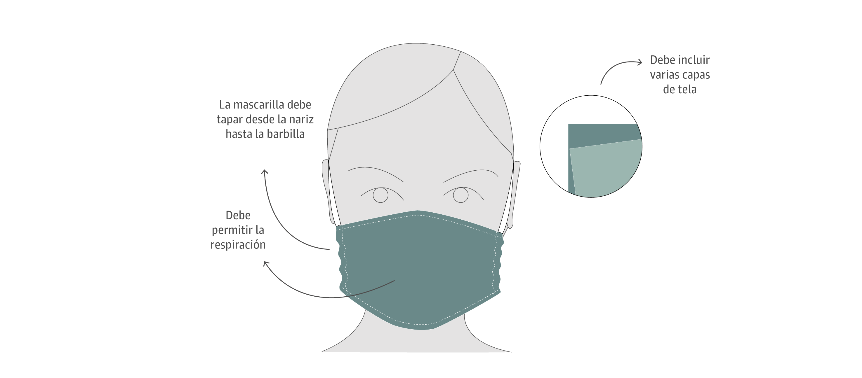 La mascarilla ha de ajustarse de manera firme, pero cómoda contra los lados de la cara. Además, debe incluir varias capas de tela y permitir la respiración.