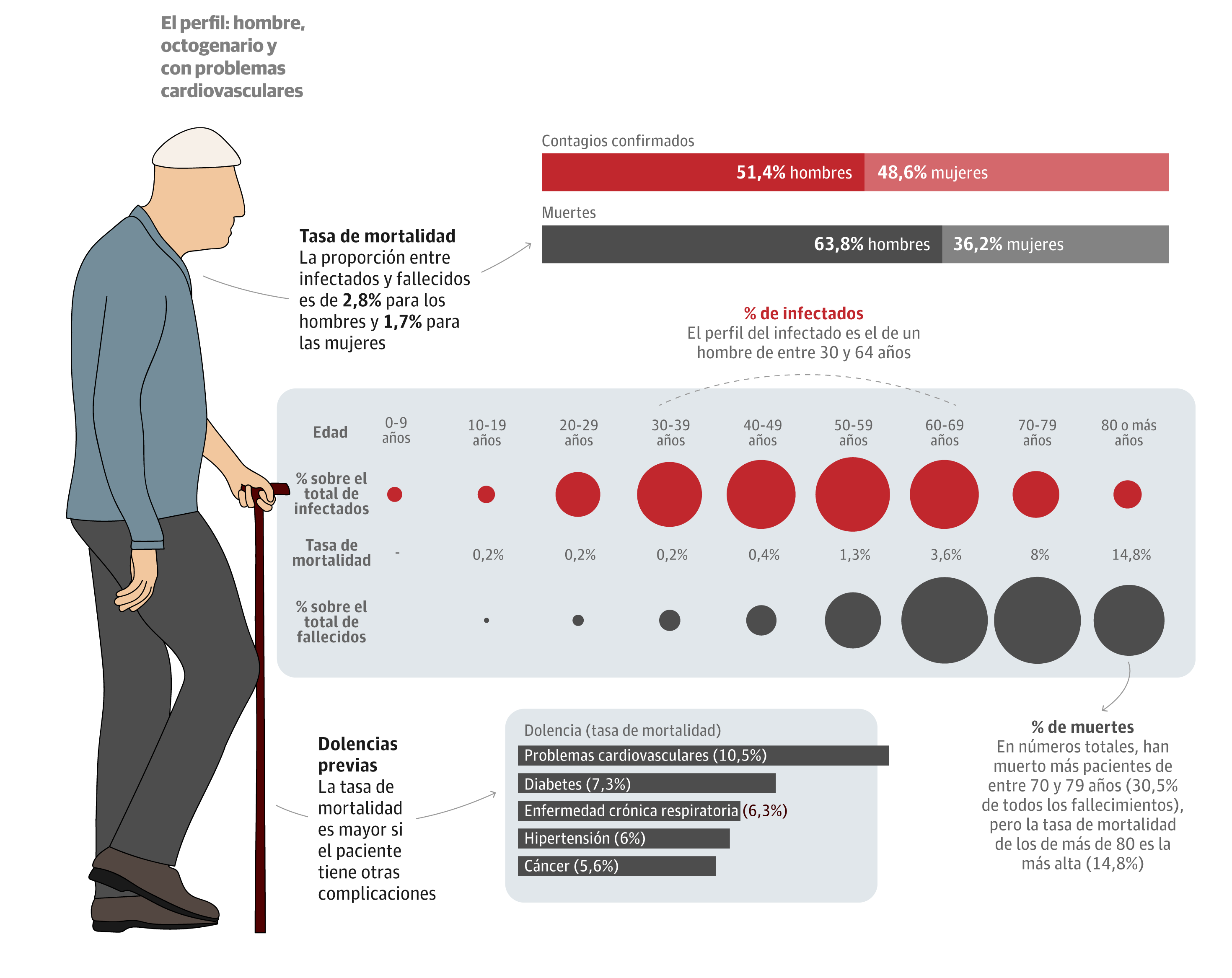 Hombres y mujeres se infectan por igual, pero son ellos los que más defunciones acumulan. El Centro para el Control y la Prevención de Enfermedades de China realizó un estudio con los primeros 44.600 contagios confirmados de coronavirus (hasta el 11 de febrero) y estableció un perfil de infectados y fallecidos.