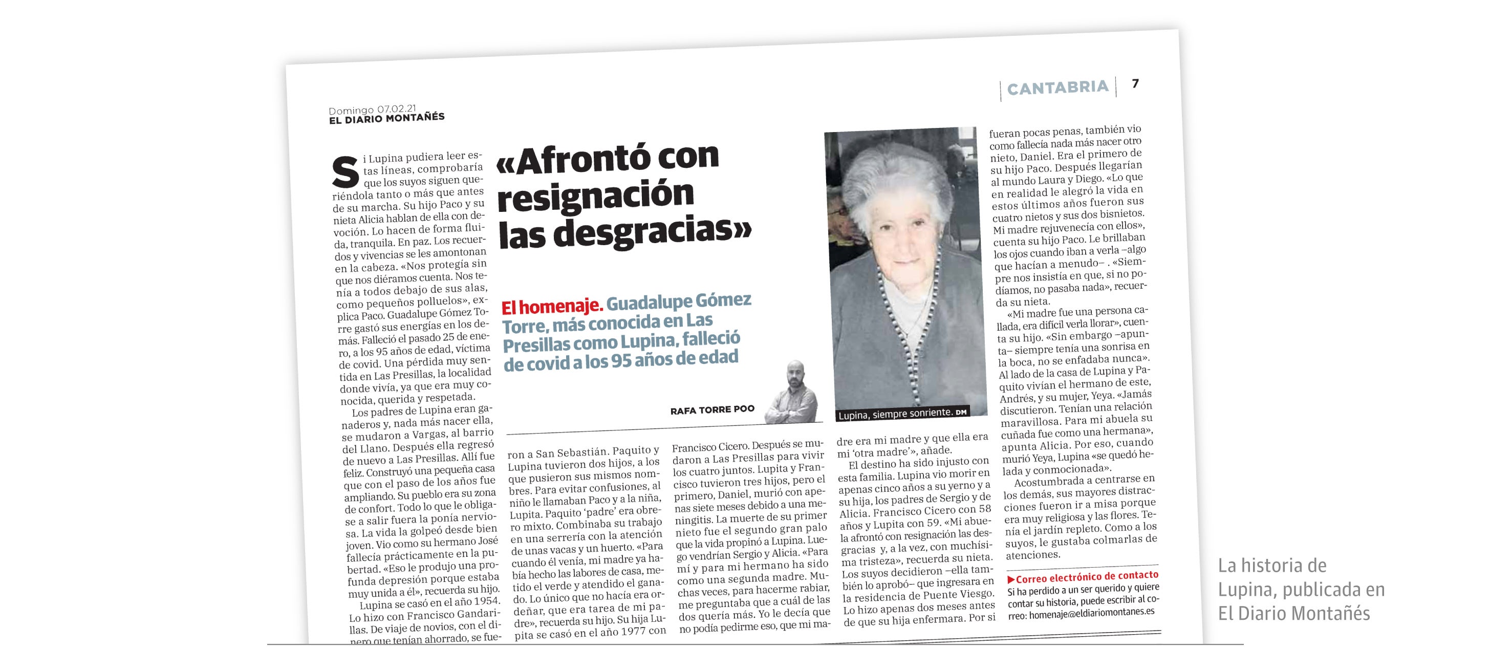 Natural de Las Presillas (Cantabria), Lupina, como la llamaban, era una mujer muy familiar, querida y respetada, entre cuyas mayores distracciones estuvo ir a la iglesia, donde «disfrutaba». Por eso cuando ni siquiera pudieron celebrar la misa con la normalidad que en esta situación es tan necesaria… «Te dicen que ese es el cadáver, pero no lo ves porque el ataúd está sellado, supones que es tu madre», explica Francisco. Tuvieron que realizar antes el entierro que la propia misa y esa es otra de las espinas que tienen clavadas.