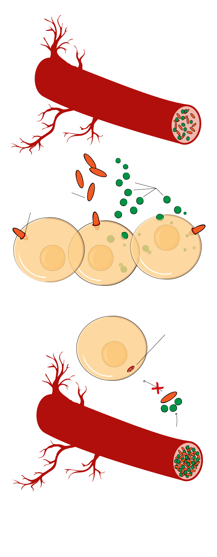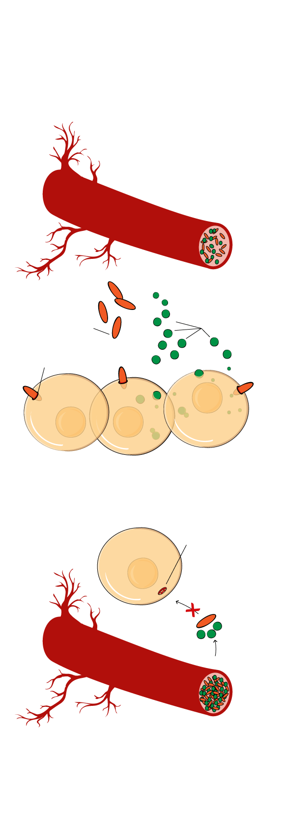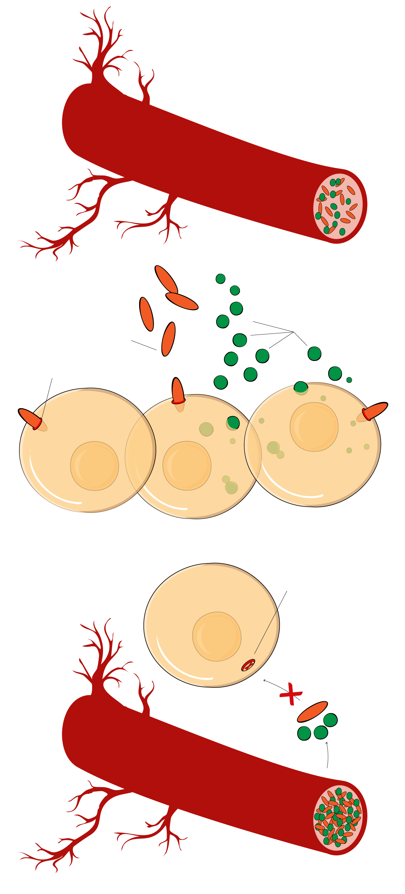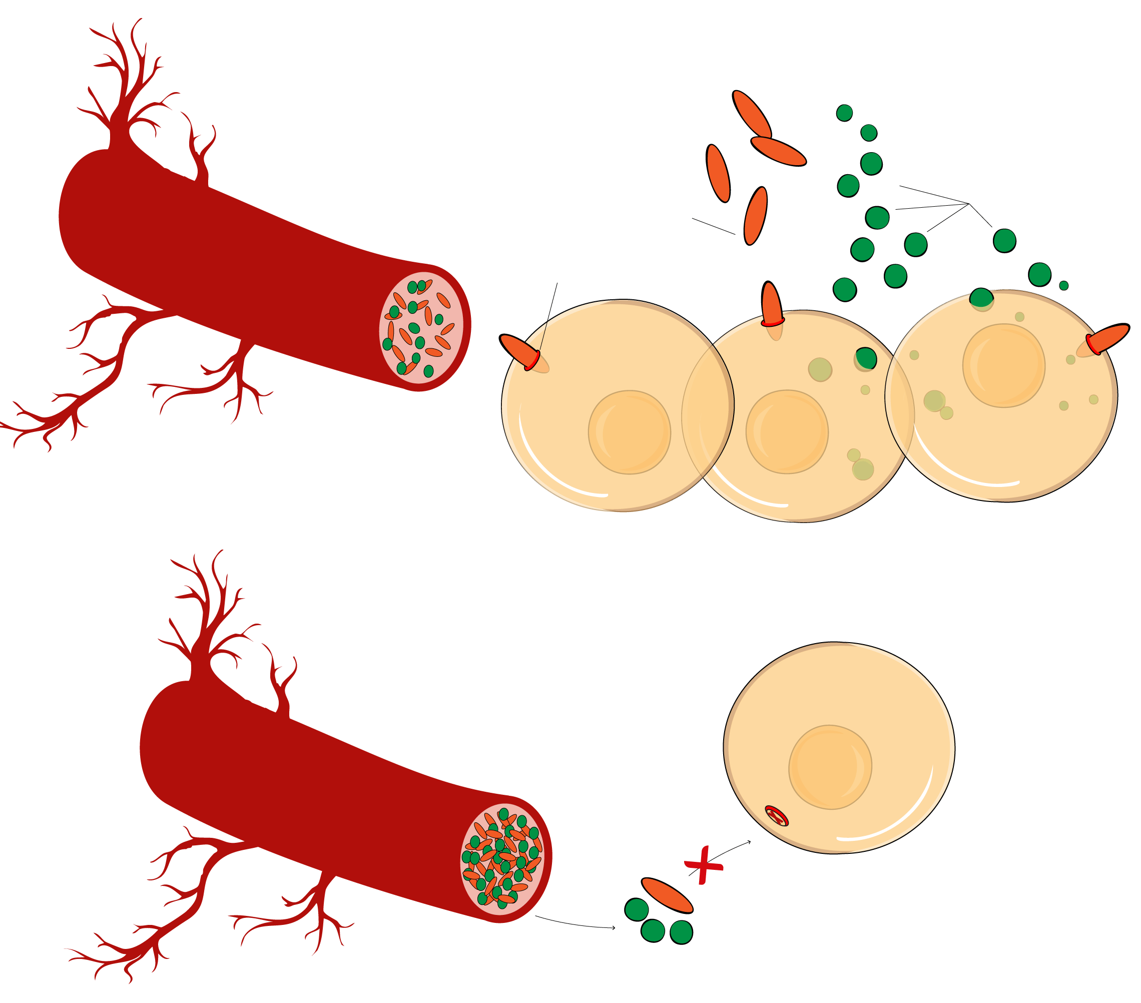 Son los vasos sanguíneos los encargados de llevar a las células de los diferentes tejidos; hígado (hepáticas), músculo (fibras musculares) y grasa (adiposas)