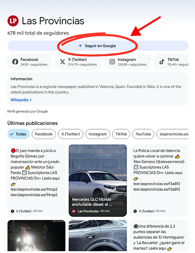 Google está cambiando la manera de ofrecer noticias a los usuarios y, a partir de ahora, desde su hilo de noticias (la pestaña del buscador en la que te aparecen noticias según tus gustos), podrás seguir a LAS PROVINCIAS. Es el método que Google está empleando con el fin de ofrecer un contenido más personalizado y específico a los usuarios.