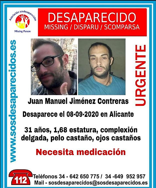 31 años, 1,68 metros y complexión delgada. Así es, a grandes rasgos, Juan Manuel Jiménez Contreras, un joven que se encuentra en paradero desconocido desde el pasado martes 8 de septiembre. Ese día se le perdió la pista en la ciudad de Alicante y según el cartel que comunica su desaparición Juan Manuel necesita medicación.