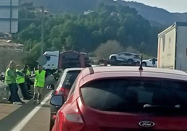 La A-23, completamente cortada tras el accidente de un camión cargado de coches