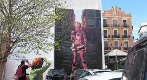 El tamaño es una de las cosas que llama la atención de la fotografía que desde hace meses envuelve una parte del barrio del Carmen. La obra de Luis Montolio se mueve entre el arte conceptual y un documentalismo de la sociedad, y desde un tiempo se ha convertido en espejo de la vida que se cuece en este céntrico barrio valenciano. El retrato que empezó todo y que se yergue majestuoso colgado de una fachada es el que ha acabado adquiriendo el nombre de 'guerrero del Carmen'. El proyecto ha continuado con más retratos en lonas gigantes. Este jueves, Montolio ha presentado en la calle Corona un retrato de la bailarina valenciana Olga Poliakoff, amiga de Luis que falleció en 2006.