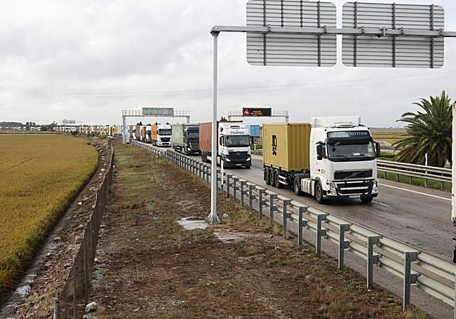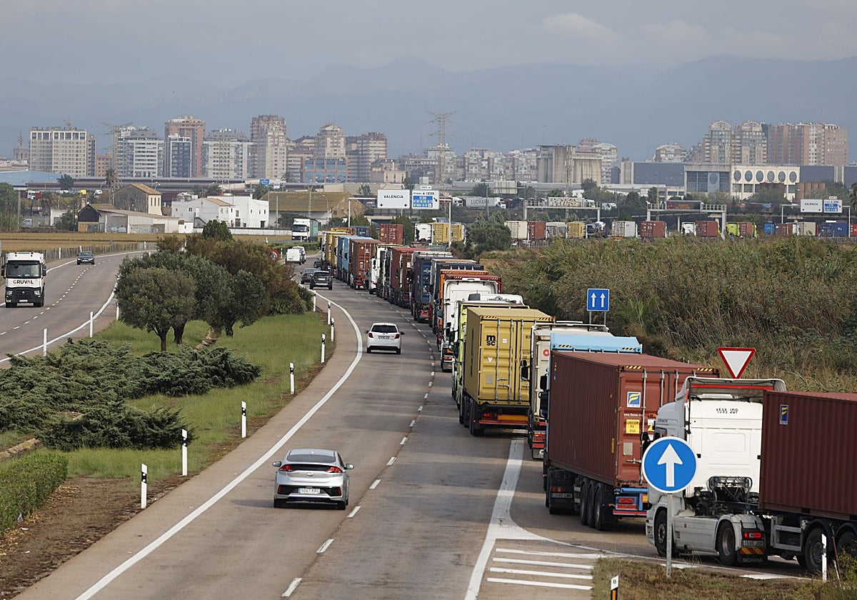 En la autovía V-30 y la CV-500, también conocida como la carretera de El Saler, a estas horas de la mañana están colapsadas por la circulación de estos grandes vehículos que tienen que acceder al interior del puerto de Valencia para dejar los contenedores del transporte internacional que desde el domingo y el lunes no pudieron descargar por los avisos de las lluvias y también para recoger los nuevos que están en los barcos atracados en el puerto de Valencia.