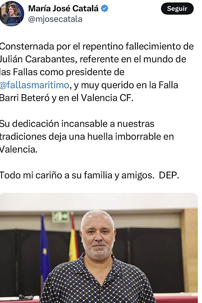 Las redes sociales ya se han llenado de reacciones por el dramático fallecimiento de Carabantes. Consternada por el repentino fallecimiento de Julián Carabantes, referente en el mundo de las Fallas como presidente del Marítimo, y muy querido en la falla Barri Beteró y en el Valencia CF. Su dedicación incansable a nuestras tradiciones deja una huella imborrable en Valencia. Todo mi cariño a su familia y amigos. DEP», ha colgado en X la alcaldesa de Valencia, María José Catalá.