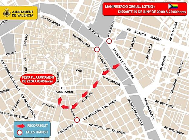 El Ayuntamiento de Valencia ha previsto un dispositivo de tráfico con motivo de la manifestación del Día del Orgullo. Así, desde el viernes 24, a las 22.00 horas, hasta el sábado 25, a las 20.00 horas, no se podrá estacionar en el paseo de la Alameda entre el Puente del Real y el de la Exposición. Además, permanecerán cortadas al tráfico las calles del recorrido de la manifestación.