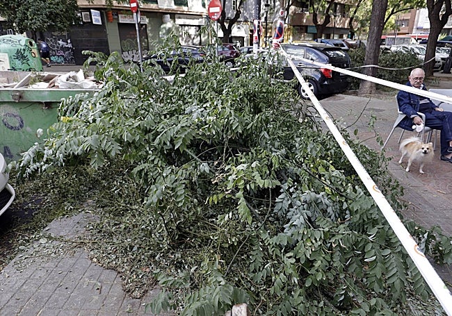Los operarios del servicio de Parques y Jardines se afanan en retirar las ramas, pero es que son demasiadas. Muchísimas. No hay parque de barrio que no tenga restos del vendaval acordonados en un rincón, a la espera de que los camiones de recogida pasen a por ellos. O en alcorques, como ocurre en la calle Jesús, junto a la plaza Pintor Segrelles. O incluso en plazas de aparcamiento, tal como se puede ver en algunas calles del barrio de Soternes. En la calle Almazora y en sus alrededores, los restos del temporal están muy visibles.