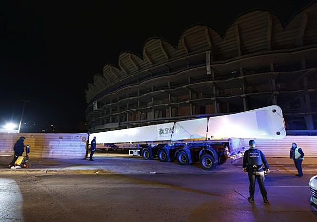Mientras la medianoche se cernía sobre Valencia, a falta de un cuarto de hora para la una de la madrugada, el Nou Mestalla palpitaba para ... acoger los dos primeros de esos enormes pilares que van a sujetar el techo del estadio. Sin duda, una circunstancia importante dentro del calendario marcado por el club en compañía de FCC para la finalización de las obras desde que se reanudaron las mismas en enero de este año. Desde primera hora de la noche en el interior del Nou Mestalla ya se veía una actividad inusual tratándose de una jornada sin trabajos en su interior por ser domingo. Y de repente aparecían dos camiones inmensos que portaban las vigas, acompañados de la Policía Local, que desde que entraron en Valencia fueron a su lado para facilitar el tránsito. Allí estaban los miembros de seguridad, que abrían las vallas para que los vehículos accedieran al interior del recinto.