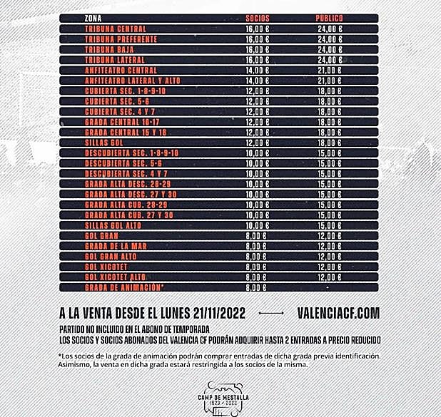El Valencia CF ha puesto a la venta las entradas para el partido amistoso del próximo viernes 16 de diciembre en Mestalla frente al Nottingham Forest. Será uno de los partidos que el conjunto valencianista disputará durante el parón del Mundial y los precios oscilan entre los 8 euros la entrada más barata y 24 la más cara.