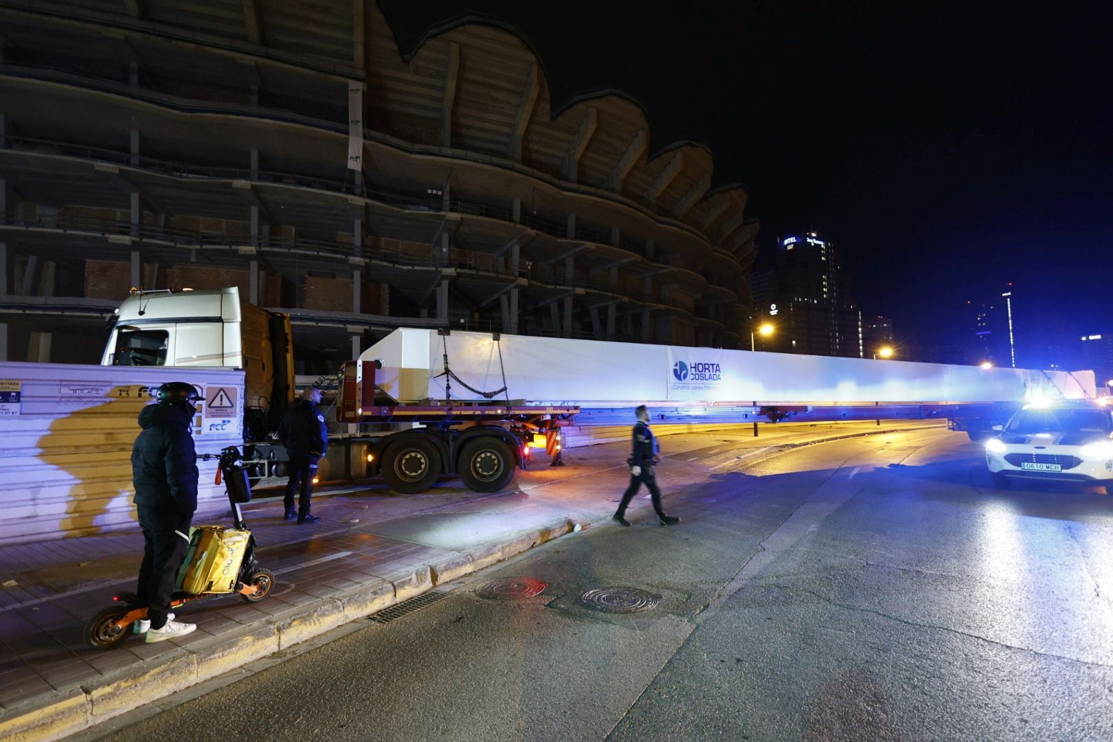 Ya están aquí. El Valencia CF ya ha recibido las primeras vigas sobre las que se sustentará la cubierta del Nou Mestalla. En total, serán 50 pilares de acero que aguantarán 4.800 toneladas de peso. Desde A Coruña, este domingo viajaban a la capital del Turia para poder introducirlas en la ciudad en una hora en la que no provocara demasiado caos en el tráfico. Aproximadamente a la 1:00 de la madrugada la que será la nueva casa blanquinegra las ha recibido.