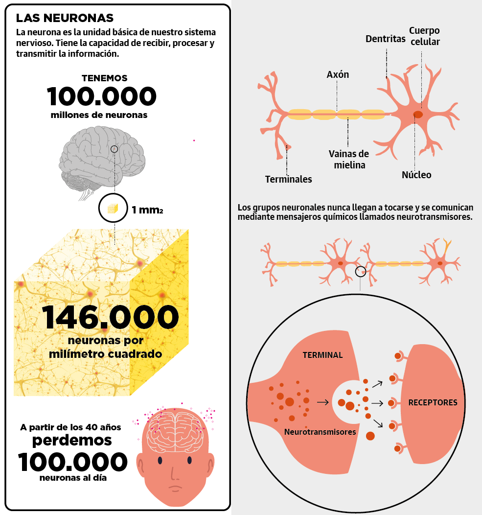 «La poda neuronal es un proceso natural por el que el cerebro elimina la basura, como cuando llevas un coche viejo al desguace. Desde los 20 años se produce una muerte natural de las neuronas, cuando envejecemos y una neurona no da más de sí se autodestruye (apoptosis). Aunque ya hay estudios que demuestran la capacidad de regeneración neuronal, no es una regeneración como la del hígado, las neuronas no son tan regeneradoras. Por eso, para contrarrestar esta pérdida hay que mantener las que quedan activas. No es tan importante la cantidad de neuronas como las conexiones neuronales que se producen. Y un enemigo acérrimo de las neuronas es la toxicidad; el alcohol, un exceso de azúcar, la tensión arterial alta, el colesterol... matan neuronas y son causa de deterioro cognitivo», ahonda Félix Viñuela.