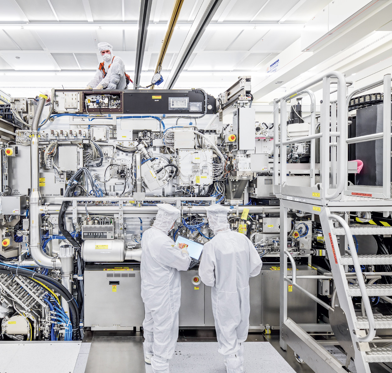 Más estéril que un quirófano. El grabado de los circuitos integrados puede verse afectado por la más mínima impureza, como una escama de piel. Por ello, quienes trabajan con ella van cubiertos por EPI. Más arriba, en la imagen que abre este reportaje, la máquina que imprime los minúsculos y laberínticos circuitos del chip. La holandesa ASML suministra máquinas como esta y controla el mercado mundial a partir de los 14 nanómetros de grosor (un cabello mide 60.000). Cobra 170 millones de euros por cada máquina.