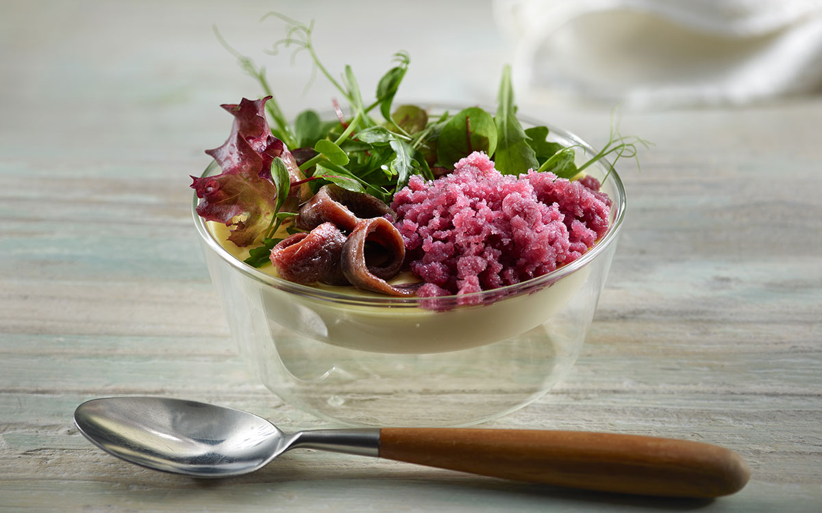 3. Acabado: se sacan las cremas cuajadas de la nevera media hora antes de comerlas y el granizado del congelador. Se ralla su superficie con un tenedor, formando un granizado. Se aliñan los brotes verdes con aceite de oliva. Sobre la crema cuajada de queso, se colocan los brotes recién aliñados, una buena cucharada de granizado y las anchoas en salazón.