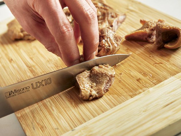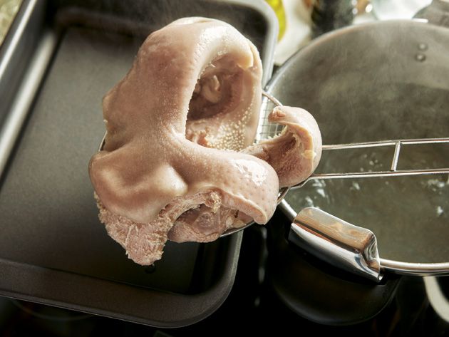 2. Se trocean los morros ya cocidos durante tres horas y se les quita el cartílago.