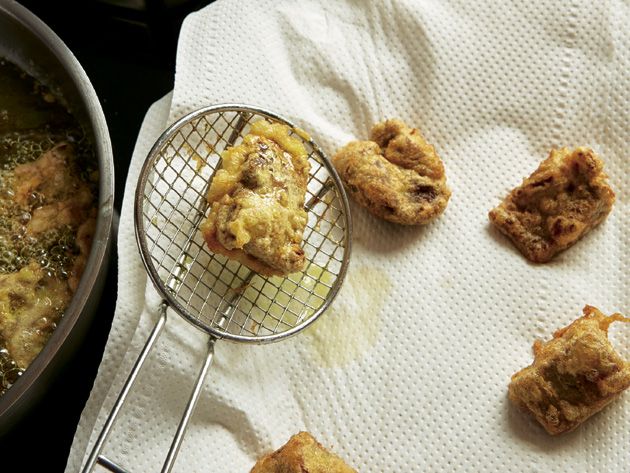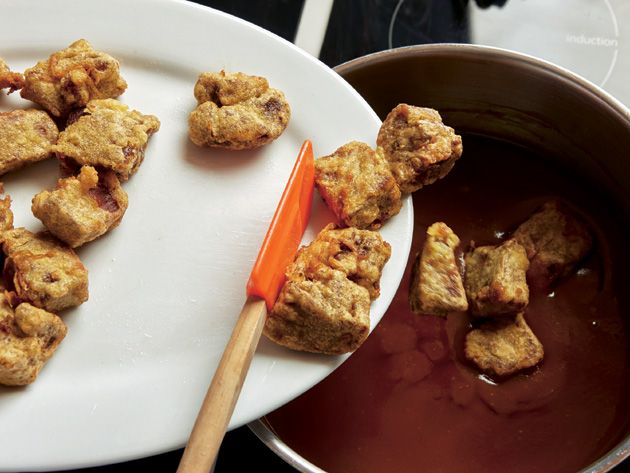3. Se rebozan los morros de ternera ya cortados en harina y huevo y se fríen.