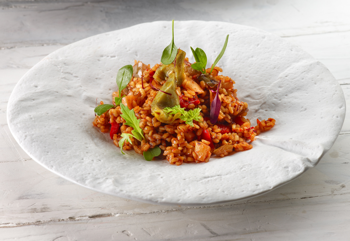 3. Acabado: para rematar el arroz, se añade aceite a la paella, se doran los pimientos y se retiran. Ahí mismo se rehogan el arroz -añadiendo el sofrito-, la salmorreta y las alcachofas y se le da unas vueltas.