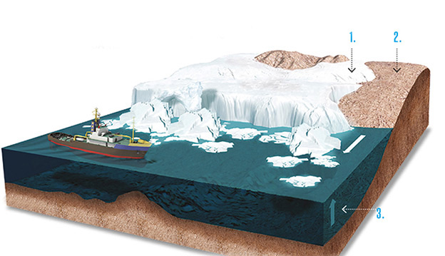 Las placas de hielo se derriten por todos lados. Pero, cada vez más, por abajo, lo que acelera su destrucción. Así funciona: el aumento de la temperatura del planeta provoca el deshielo de un glaciar y el punto donde este se adhiere al lecho marino retrocede tierra adentro. Deja así un hueco que facilita la filtración del agua cada vez más cálida del océano bajo sus cimientos.