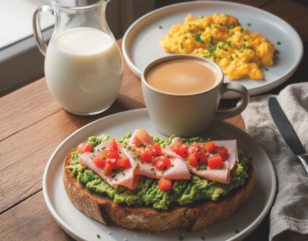 «Café con leche entera normal. Una tostada con aceite, tomate, sal, aguacate y jamón york. Y unos huevos revueltos».